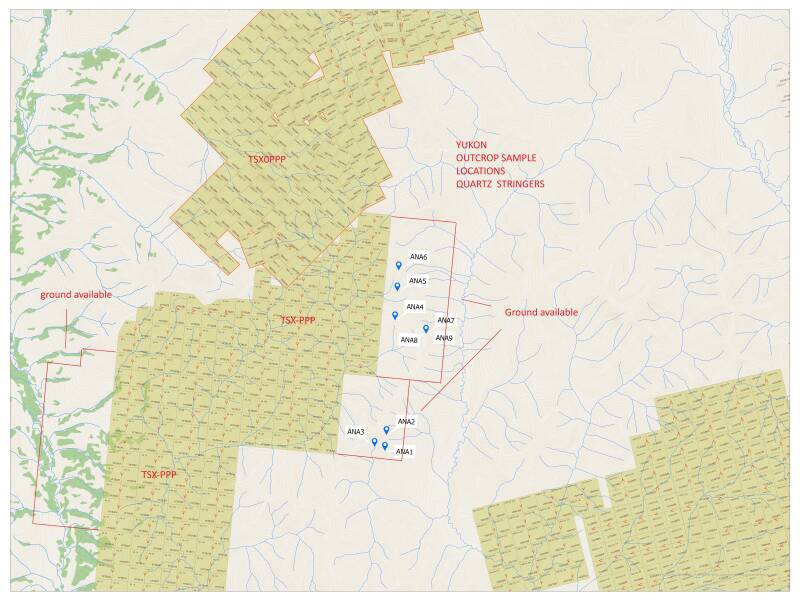 GROUND ADJACENT AVAILABLE FOR SALE AS PER THE MAP IMAGE. 60 Units adjacent on the east with 9 rock samples with smoky quartz and carbonate veining taken from outcrop seen while staking. Additional 40 units on west side.